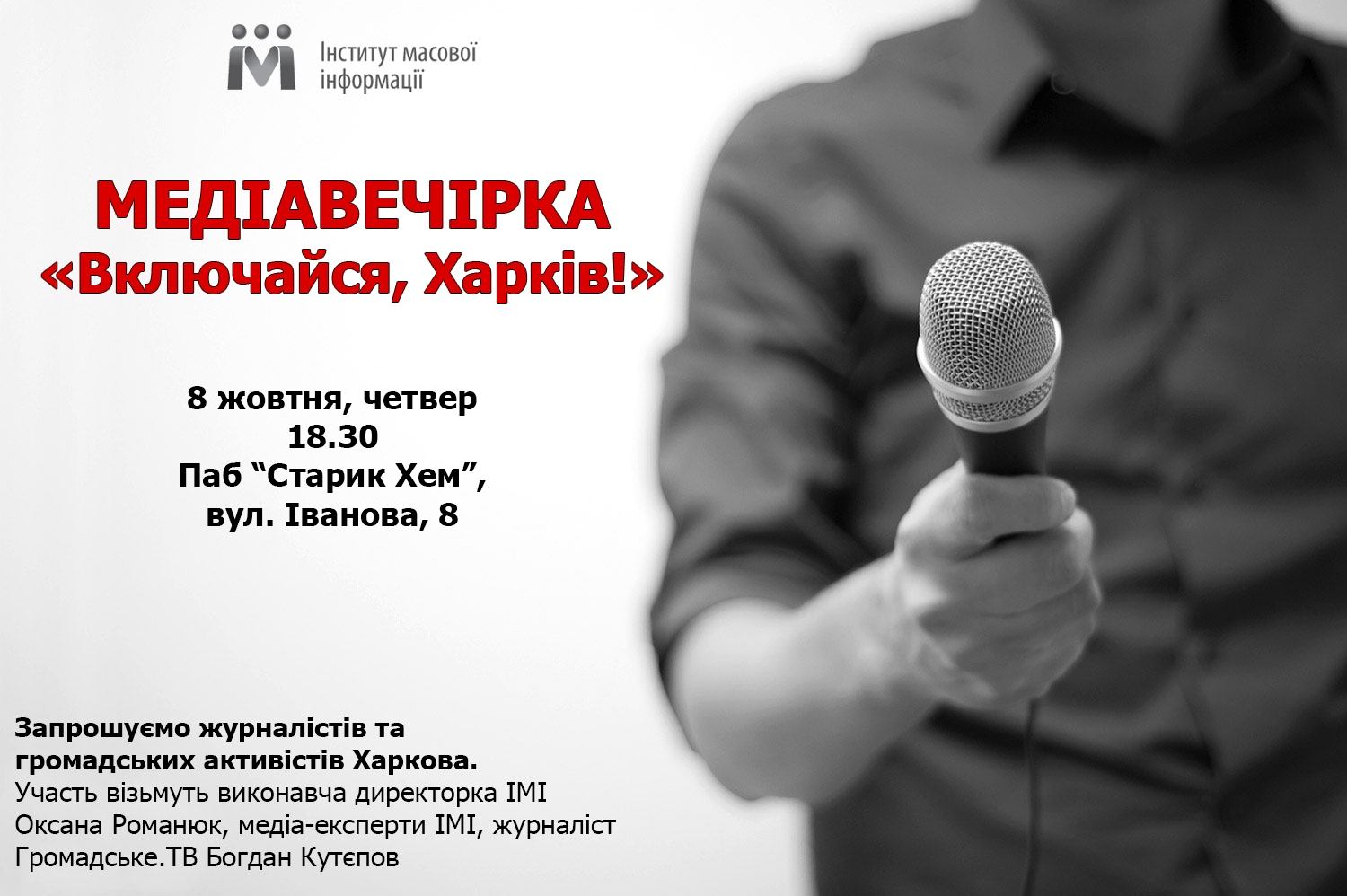 Запрошуємо харківських журналістів та громадських активістів, які займаються місцевою тематикою, на медіавечірку “Включайся, Харків!”, організовану Інститутом масової інформації. Участь візьмуть виконавча директорка ІМІ Оксана Романюк, медіа-експерти ІМІ, журналіст Громадське.ТВ Богдан Кутєпов.