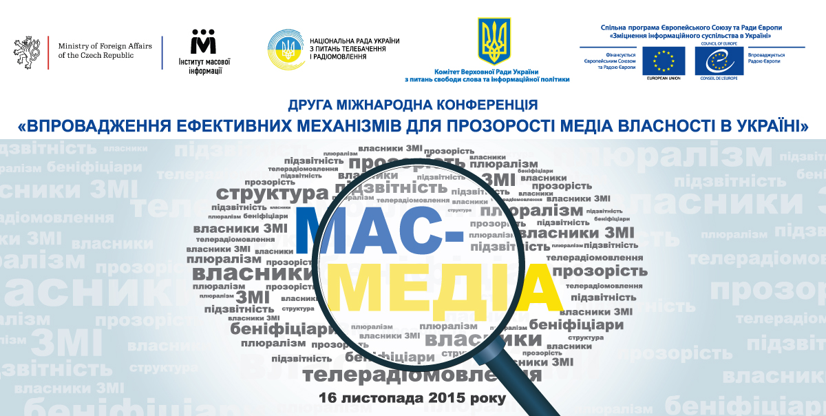 16 листопада у Києві пройде Друга міжнародна конференція «Впровадження ефективного механізму для прозорості медіавласності в Україні», організована Комітетом Верховної Ради України з питань свободи слова та інформаційної політики, Національною радою України з питань телебачення і радіомовлення та ГО «Інститут масової інформації», за підтримки Чеського посольства в Україні та спільної програми Європейського Союзу та Ради Європи «Зміцнення інформаційного суспільства в Україні».