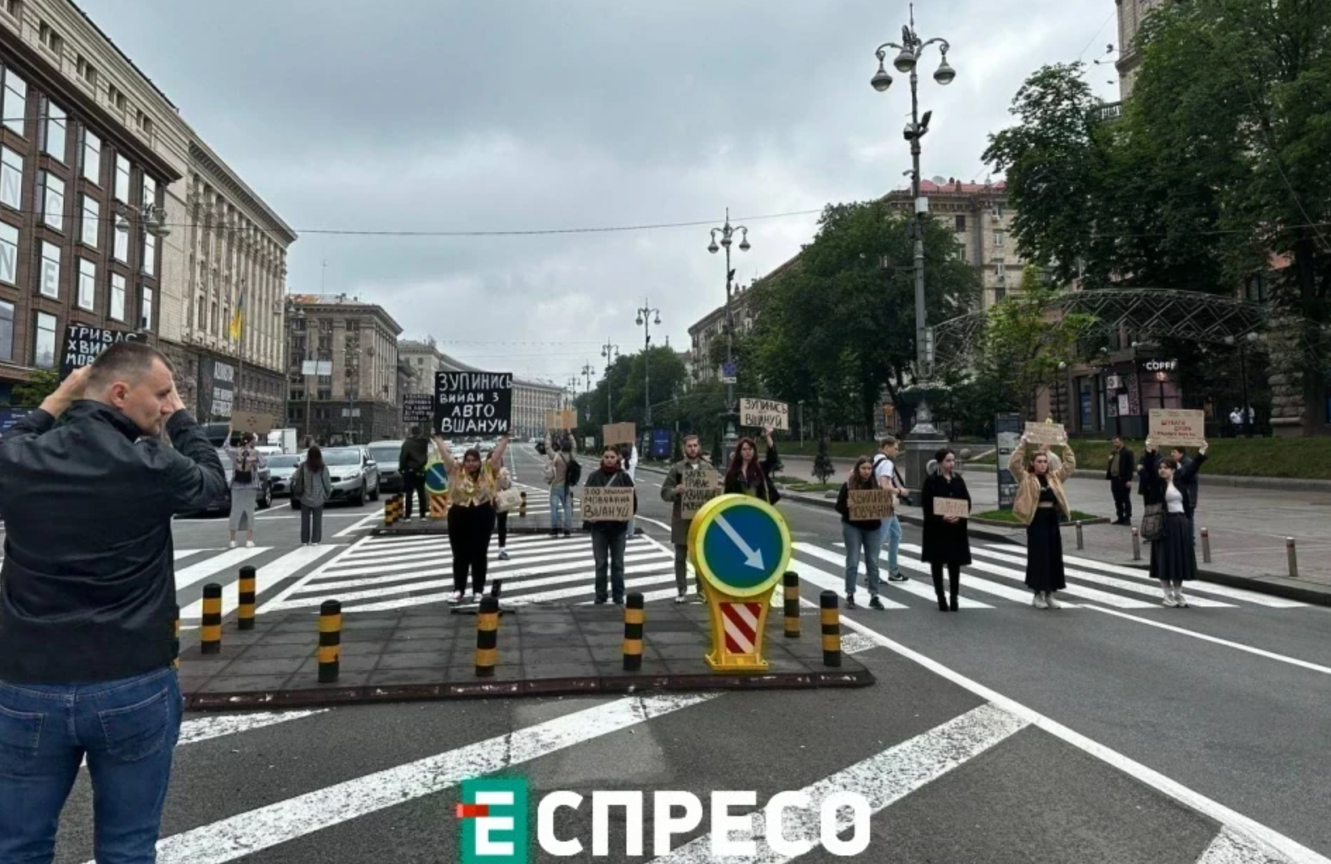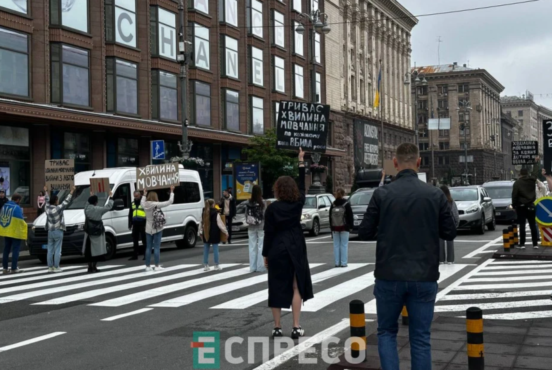 Акція відбулася на перехресті вулиць Хрещатик і Богдана Хмельницького – люди зупинилися на хвилину мовчання, щоб ушанувати памʼять Ірини.