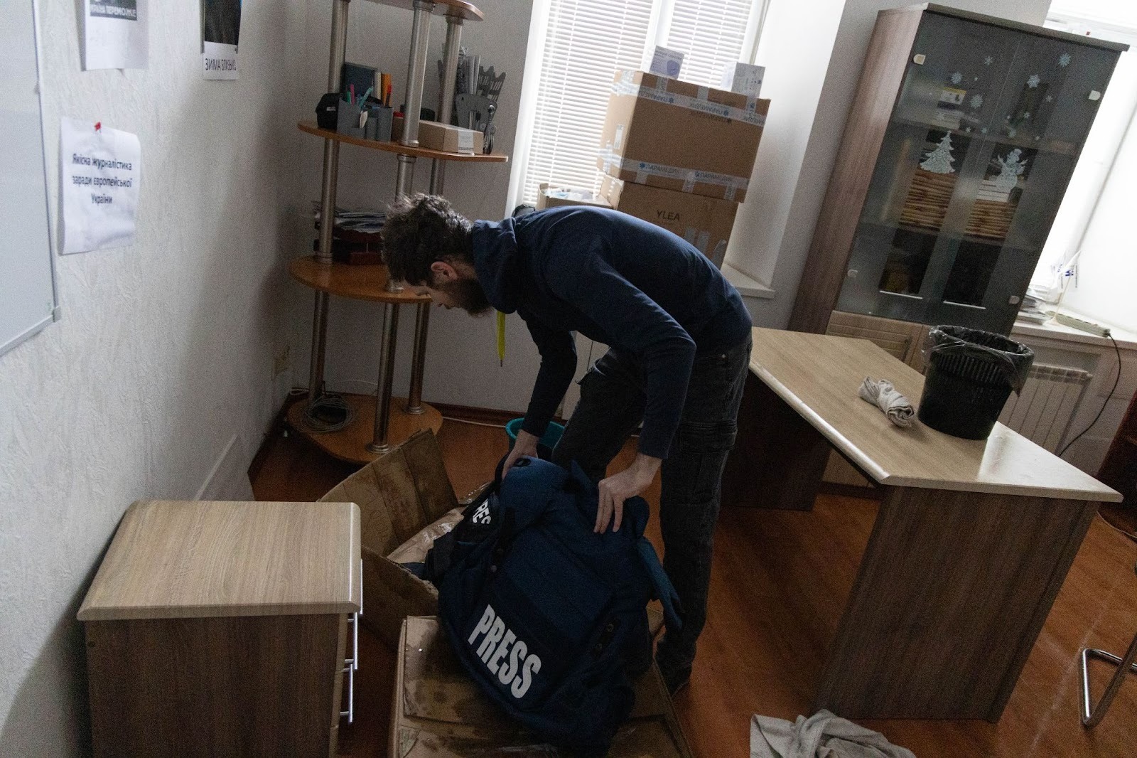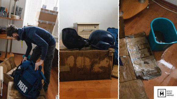 Кімнату, де зберігалися захисне спорядження та енергетичне обладнання, які ІМІ надає в користування медійникам, — бронежилети, шоломи, аптечки, зарядні станції — залило. Вода потрапила, зокрема, на офісну техніку та обладнання.