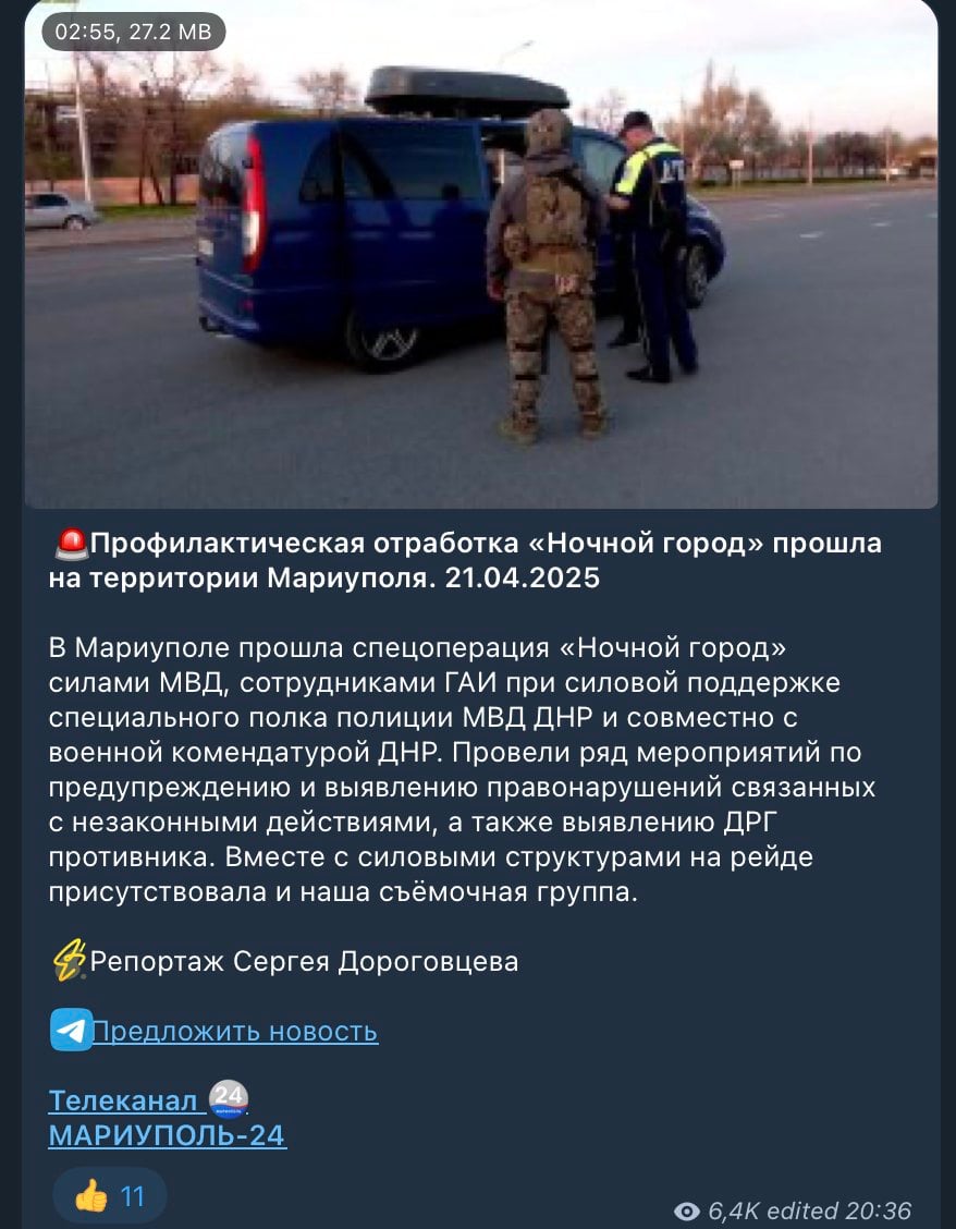 Крім того, зазначає представниця ІМІ, на рейді, який пропагандисти називають “профілактичне відпрацювання “Нічне місто”, був помічений ще один маріупольський медійник, який пішов на співпрацю з окупантами. Це фотограф, громадський активіст і громадський журналіст Сергій Дороговцев. У телеграм-каналі окупаційного каналу виклали його репортаж з рейду.