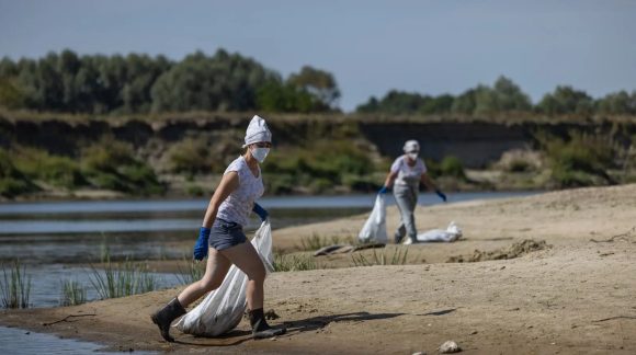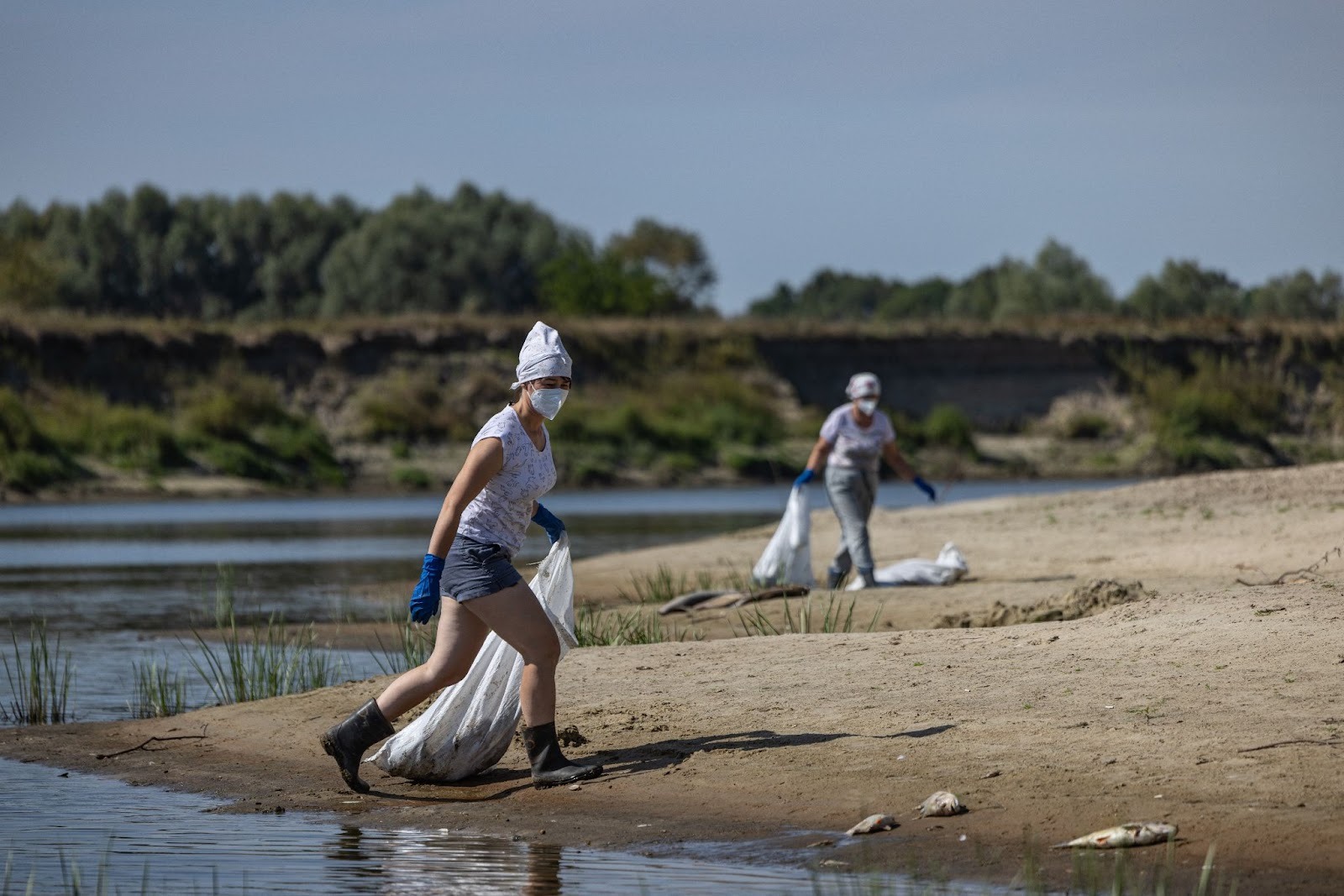 Місцеві жителі збирають мертву рибу на отруєній Десні, Чернігівська область, вересень 2024 року. Фото: Стас Козлюк