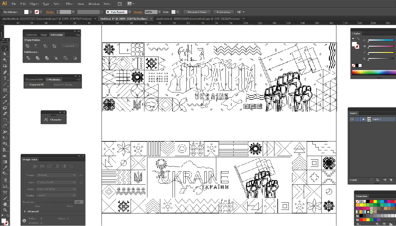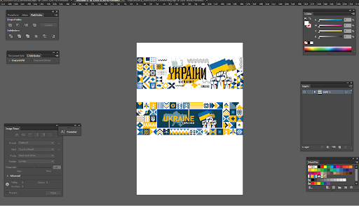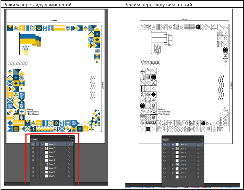 На другому етапі програма Adobe Illustrator працювала з векторними об’єктами, які для зручності в роботі розміщують на різних шарах. Панель шарів окреслена червоним. Частина елементів розташована на шарах, які вище, інша – які нижче.