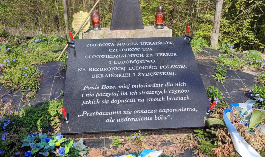 “Спільна могила українців, членів УПА, відповідальних за терор і геноцид беззахисного польського, українського і єврейського населення. Господи, змилуйся над ними й не залічи їм страшних вчинків, які вони скоїли над своїми братами. “Прощення не означає забуття, а зцілення болю”.