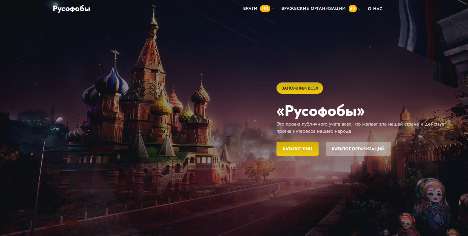 Також автори платформи стверджують, публікують повні досьє на агентів “п’ятої колони” в Росії та за її межами.