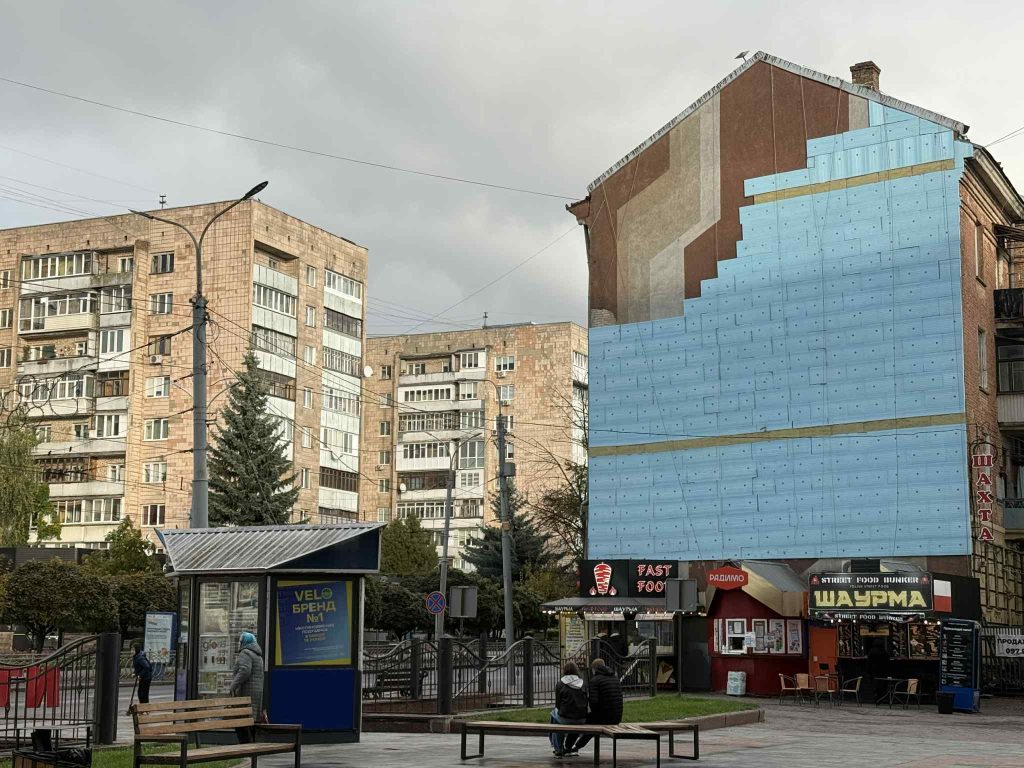Мурал пам’яті Тараса Давидюка планують розмістити на стіні будинку в центрі міста, біля ЦУМу. Зараз там тривають роботи з утеплення стіни, а раніше висіло панно з радянських часів. Фото: Ганна Калаур