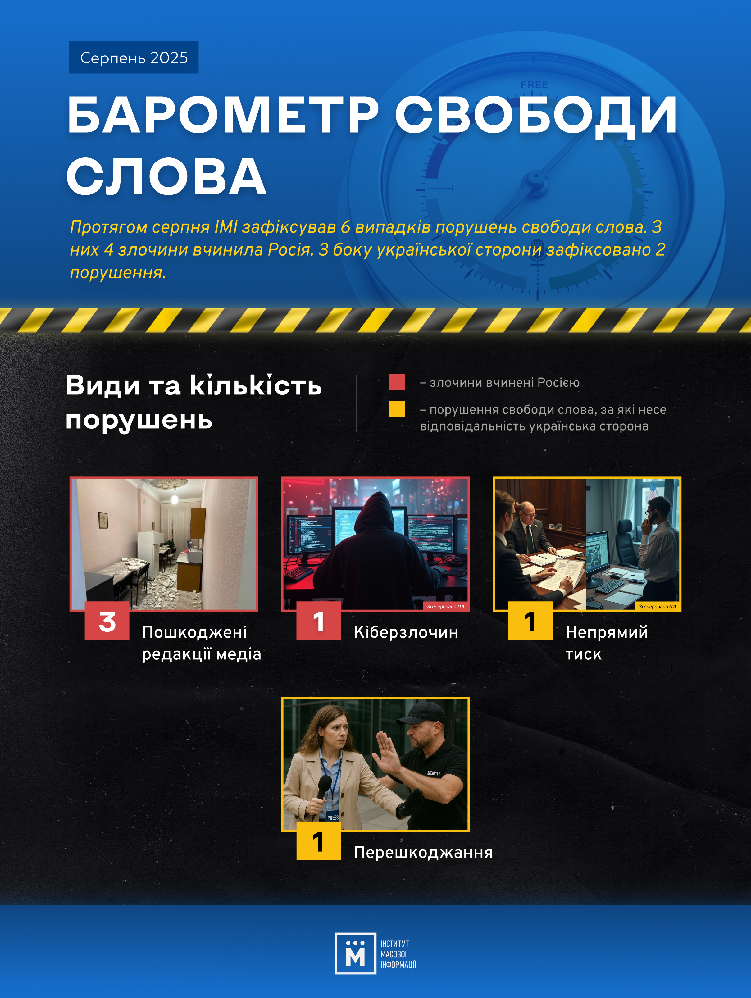 За серпень ІМІ зафіксував чотири злочини проти медіа та журналістів, які скоїла Росія. Це випадки пошкодження редакцій медіа та кіберзлочини.
