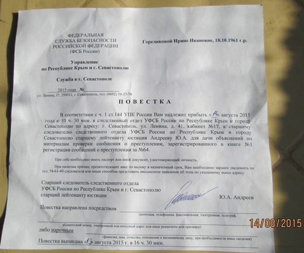 За словами Горелікової, о 10 ранку до неї додому прийшли двоє чоловіків у цивільному і вручили їй повістку на допит, сказавши збиратися і їхати з ними в управління ФСБ.
