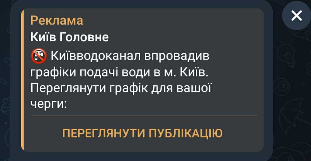 У низці анонімних телеграм-каналів поширюють рекламну публікацію з дезінформацією про те, що “Київводоканал” нібито запровадив графіки подачі води для жителів столиці.