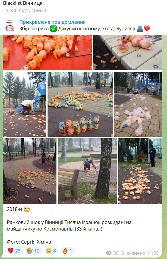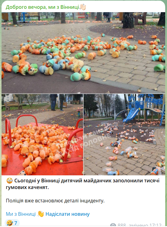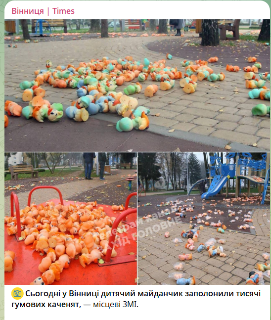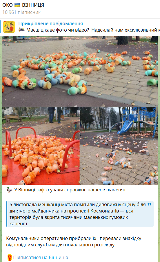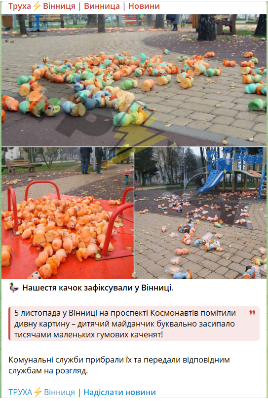 У Вінниці низка місцевих телеграм-каналів поширила повідомлення про тисячі гумових качок проспекті Космонавтів. Це виявилося новиною семирічної давності. Лише частина з каналів виправила повідомлення, доповнивши “новину” датою події. Подія насправді трапилася ще 2018 року. Тоді про неї писали чи не всі місцеві медіа. За роки знайти того, хто закидав проспект гумовими каченятами, так і не вдалося.