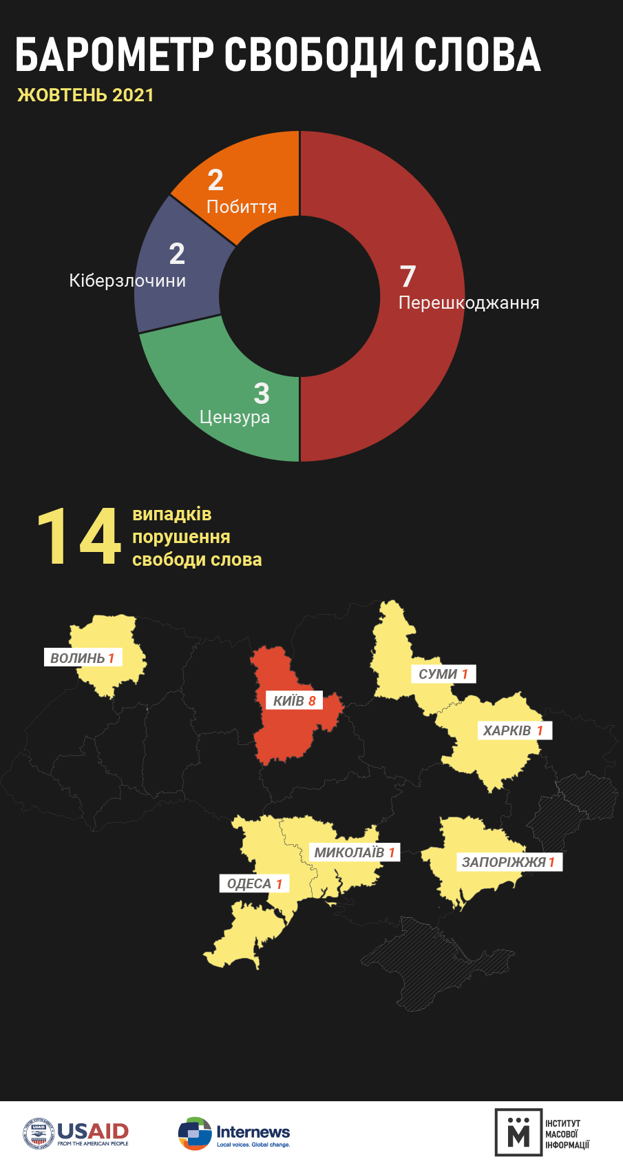 Найбільше порушень зафіксовано в категоріях “перешкоджання” (вісім) та “цензура” (три). Також зафіксовано по два випадки побиття та кіберзлочинів.