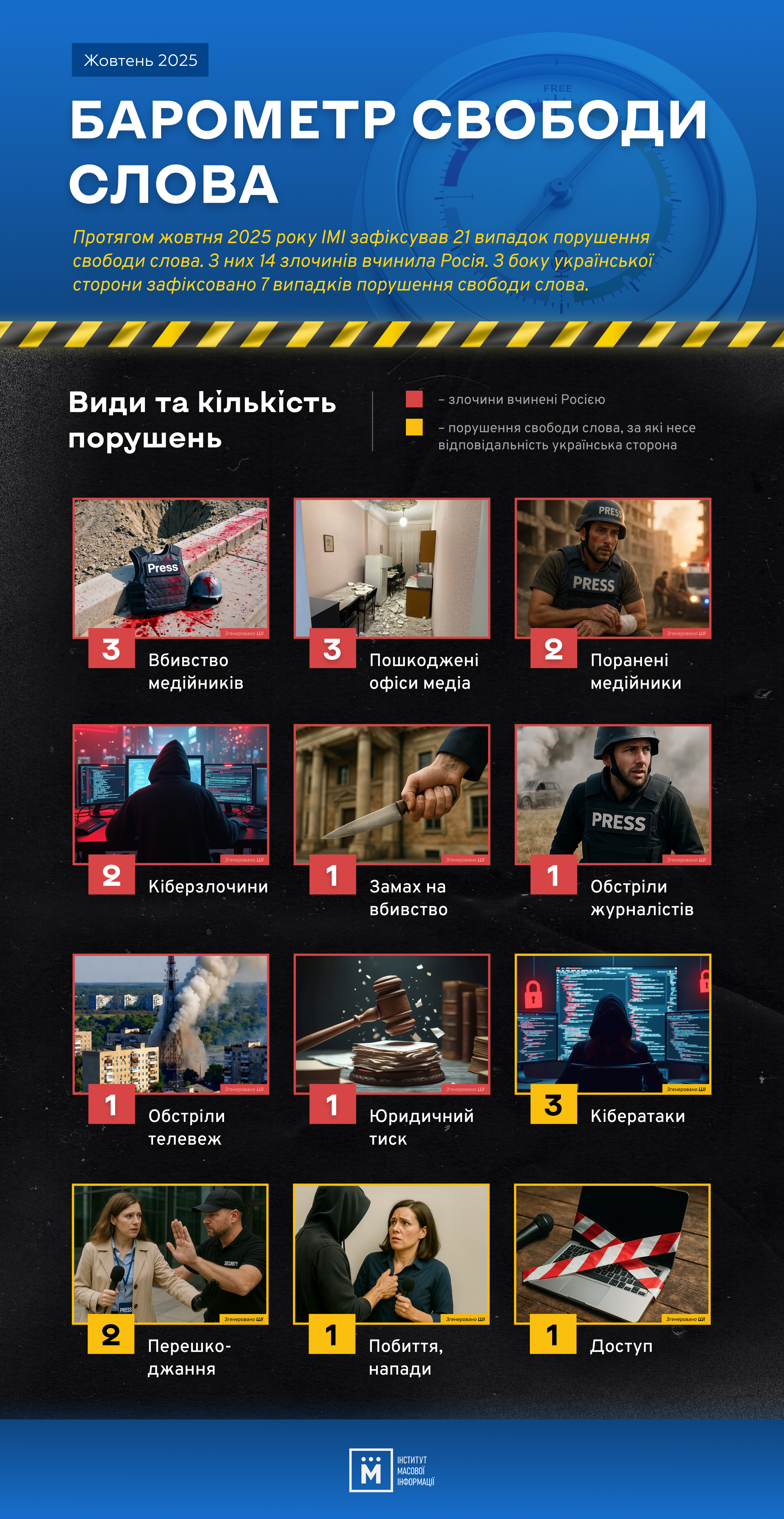 Російські злочини проти медіа та журналістів: убивство медійників та замах на їхнє життя, обстріли журналістів та їхнє поранення, пошкодження офісів медіа, обстріли телевеж, кіберзлочини та юридичний тиск.