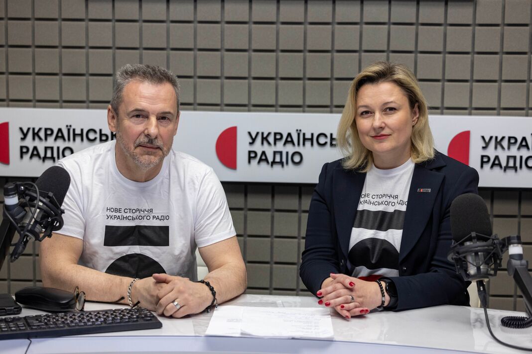 Головний продюсер Українського радіо Євгеній Чиж та виконавча продюсерка Юлія Шелудько. Фото – Express“Ми змушені були впровадити додаткові заходи безпеки, але також маємо чіткий план дій у разі знищення студії – ми мовитимо й далі”, – зазначив Євген Чиж.
