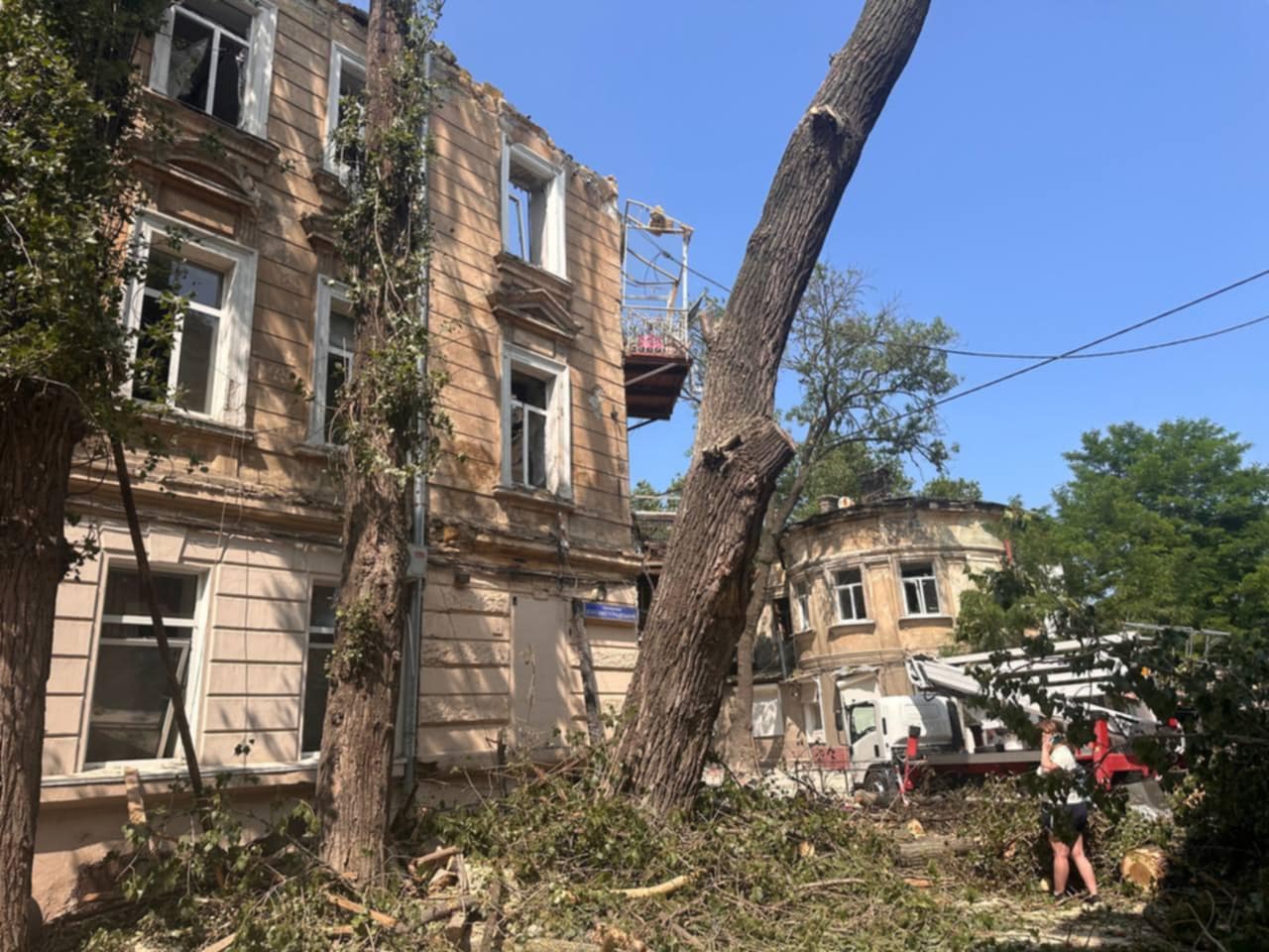 “У нас усе нормально, ми цілі, техніка ціла. Але біда в сусідів. Пожежу загасили ще вночі, зранку на місці вже працюють комунальні служби”, – розповіла журналістка.