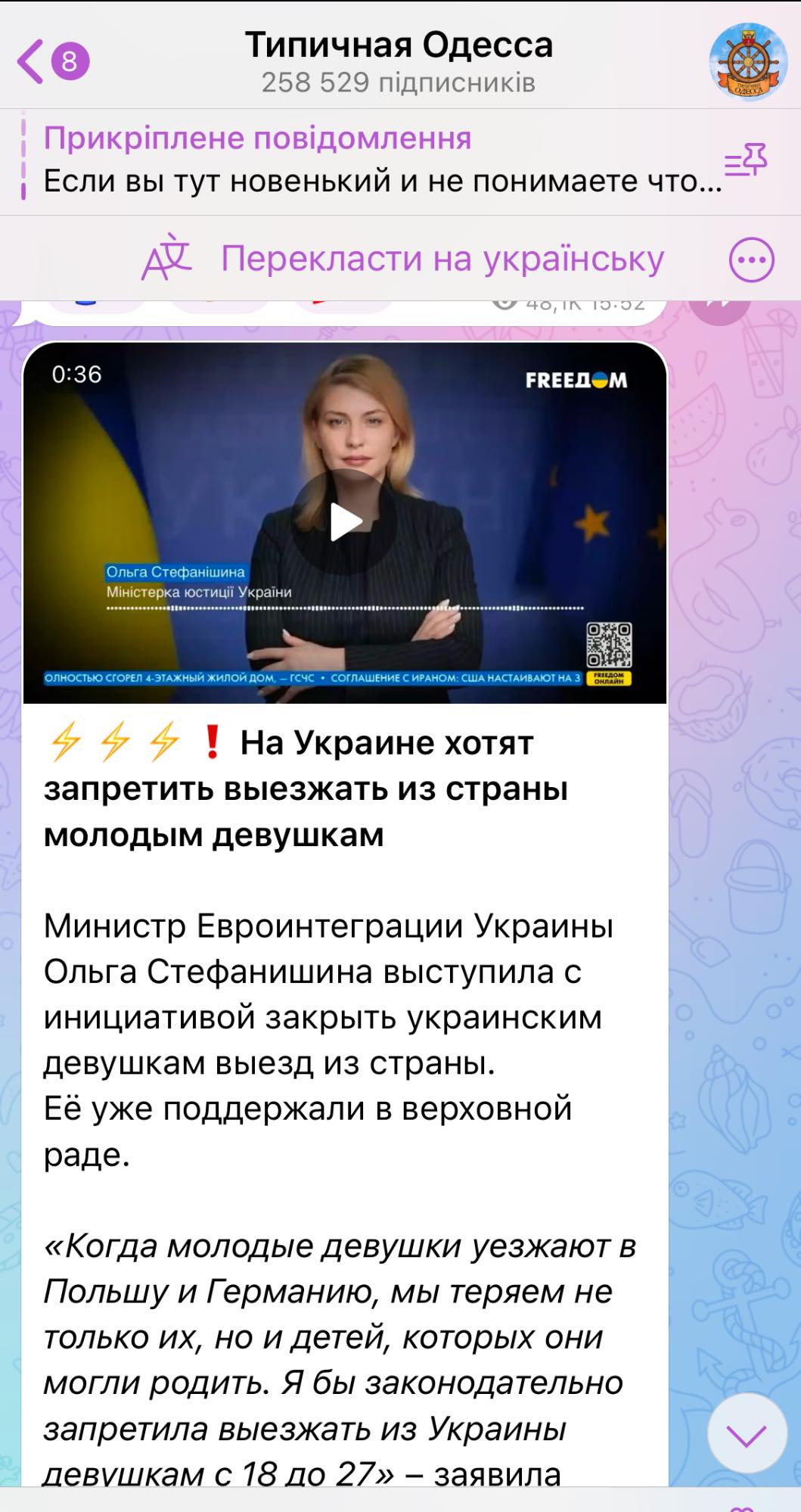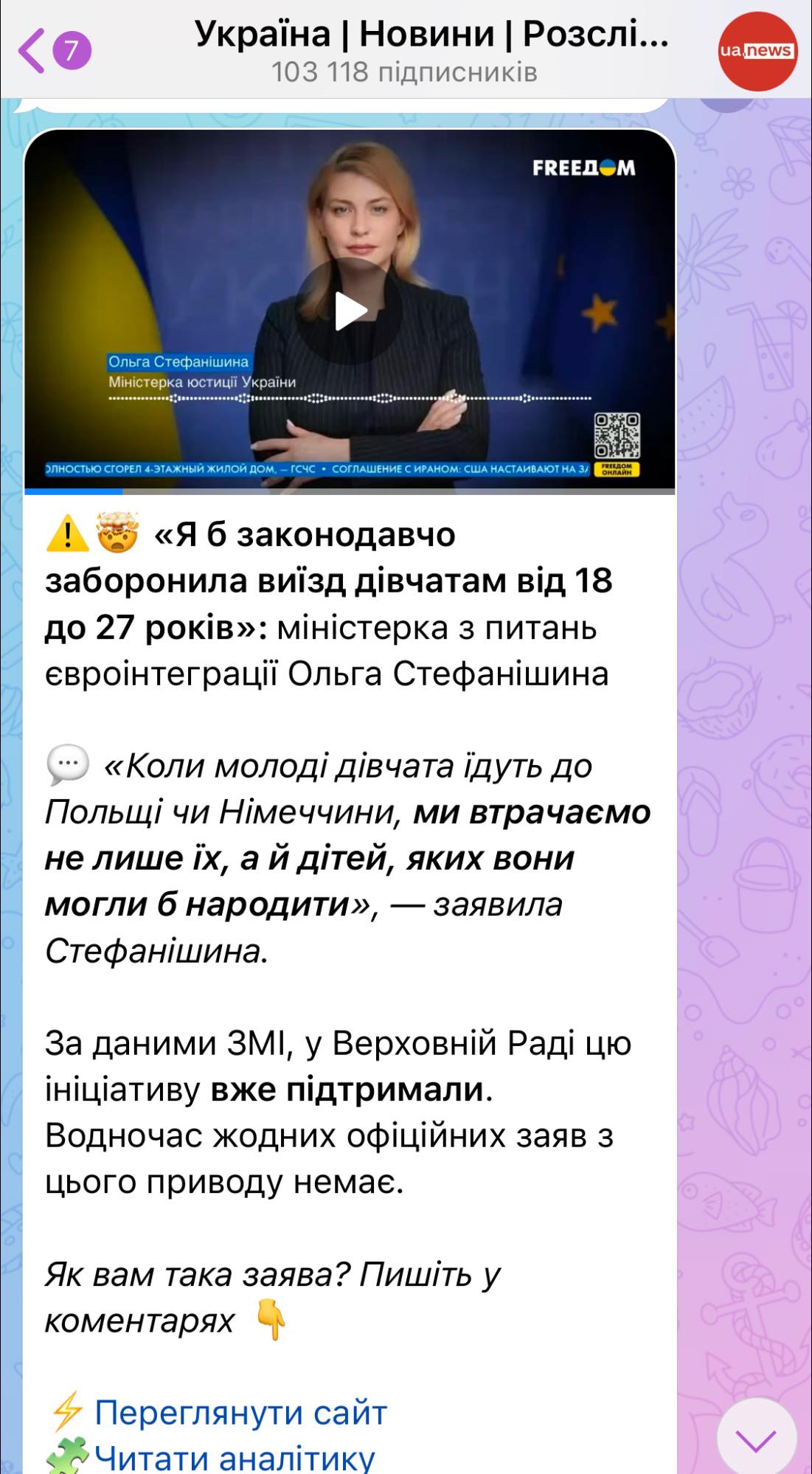 Державне підприємство “Мультимедійна платформа іномовлення України” (ДП “МПІУ”) заявило, що 25 червня невідомі використали логотип телеканалу FREEДОМ для створення фейку про те, що віцепрем’єр-міністерка з питань європейської та євроатлантичної інтеграції – міністерка юстиції Ольга Стефанішина нібито виступає за заборону виїзду з України молодим жінкам.