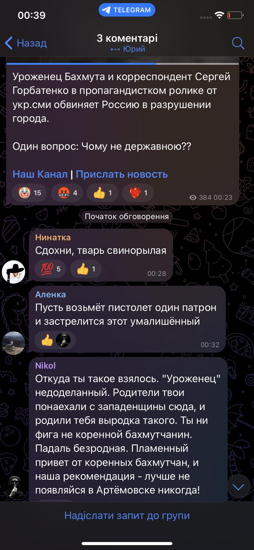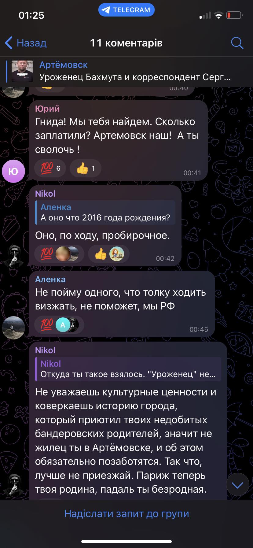 “На мою думку, такі речі пишуть і російські боти, і звичайні люди, яких або змалечку виховали в радянсько-імперських традиціях, або які скалічені російською пропагандою. Такі атаки бували й раніше. Зокрема, подібні речі писали й пишуть у костянтинівських, слов’янських, краматорських пабліках у телеграмі. Цікаво, що цим персонажам відповідали користувачі, які ставали на мій захист. Я їм дуже вдячний за це!” – зауважив кореспондент.
