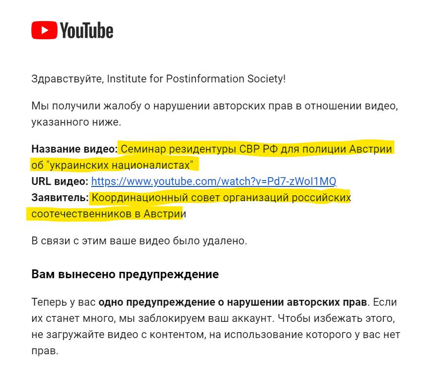 Ютуб видалив відео під назвою “Семинар резидентуры СВР РФ для полиции Австрии об “украинских националистах”.