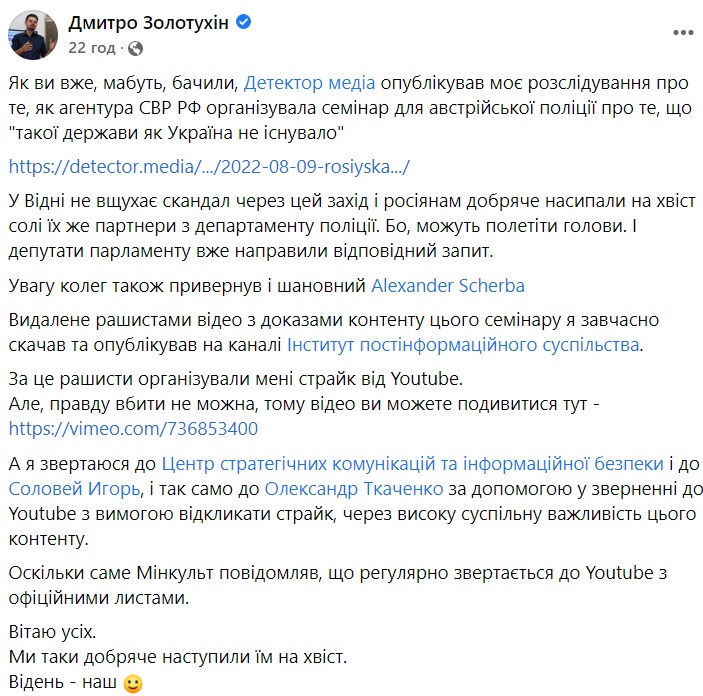 Як пише Zmina, про це повідомив його автор – медіаексперт, ексзаступник міністра інформаційної політики України Дмитро Золотухін на своїй сторінці у фейсбуку. Причиною санкцій з боку платформи стало “порушення авторських прав за скаргою Координаційної ради організацій російських співвітчизників в Австрії”.