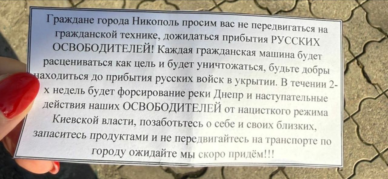 У місті Нікополь (Дніпропетровська область) російська пропаганда посилилася синхронно зі зростанням інтенсивності російських атак. За останні два тижні російські війська за допомогою дронів скидали в різних районах Нікополя свої пропагандистські листівки. Про це журналістці Інституту масової інформації Валентині Троян розповіла журналістка, головна редакторка нікопольського онлайн-видання “Прихист” Анна Целуйко.