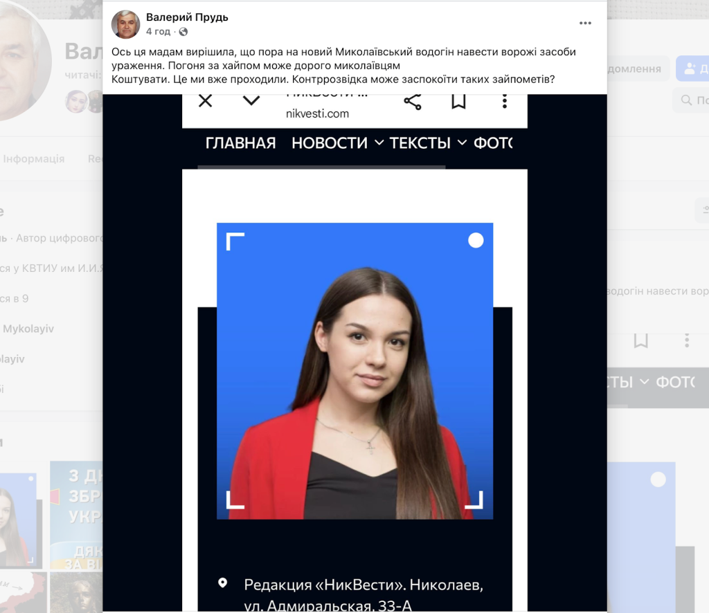 “Ось ця мадам вирішила, що пора на новий Миколаївський водогін навести ворожі засоби ураження. Погоня за хайпом може дорого миколаївцям Коштувати. Це ми вже проходили. Контррозвідка може заспокоїти таких хайпометів? Там матеріал містить світлини водогону і багато конкретики для ураження. Не хочу допомагати окупантам. А на сторінку газети не важко знайти”, – написав житель Миколаєва Валерій Прудь на своїй фейсбук-сторінці.