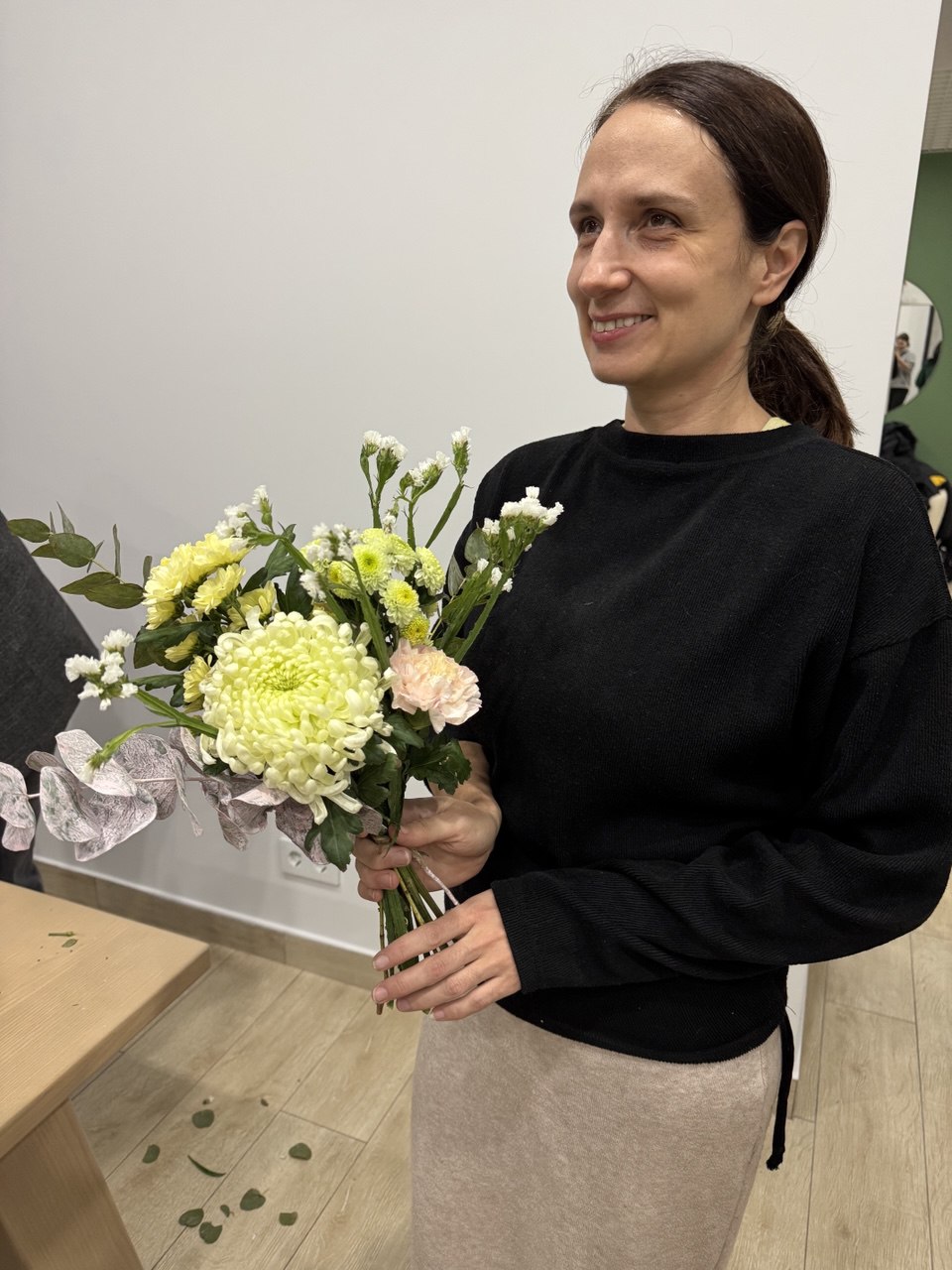 “Всі ми в дитинстві складали букети з польових квітів чи тих, що збирали на городі в бабці, але сьогоднішній майстер-клас показав, що можна поєднувати не лише традиційні квіти, а й різні рослини й від цього букет тільки виграє”, – поділилася своїми враженнями журналістка-фрілансерка Оксана Банкова.