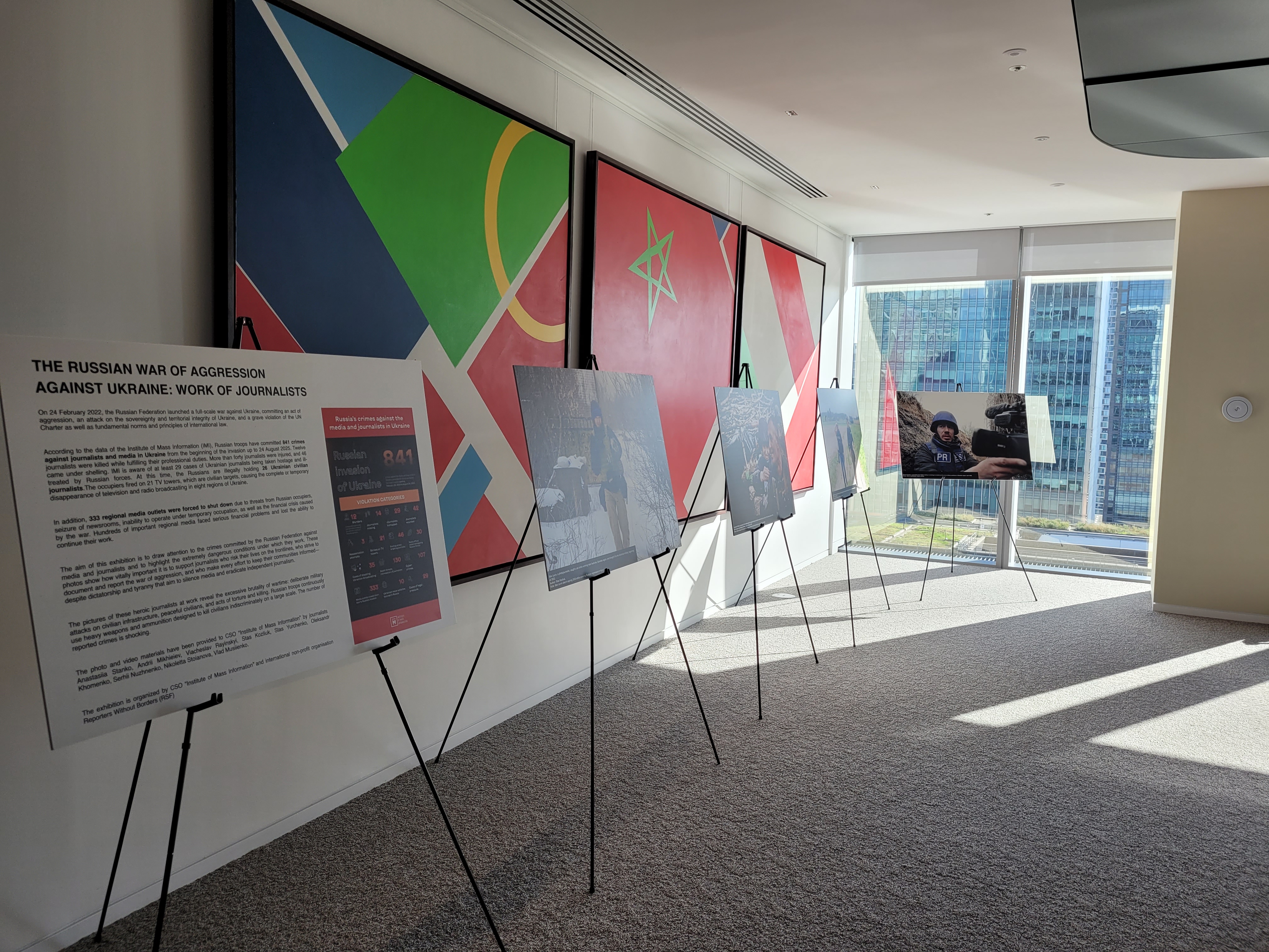 Виставка охоплює стенд з інформацією про Моніторинг російських злочинів проти журналістів і медіа, який Інститут масової інформації веде з 24 лютого 2022 року. Так, за три з половиною роки повномасштабного вторгнення Росія скоїла 841 злочин проти медіа і журналістів в Україні. Зокрема, 12 журналістів були вбиті Росією під час роботи, 333 медіа припинили роботу через бойові дії й наслідки війни, щонайменше 26 українських медійників Росія незаконно утримує в ув’язненні.