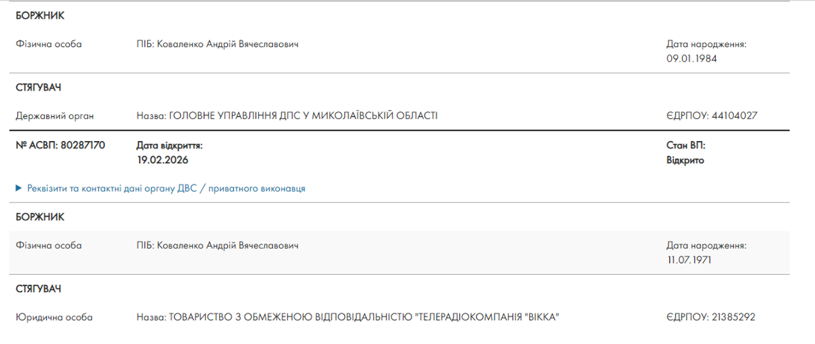 Скриншот ІМІ з автоматизованої системи виконавчих проваджень