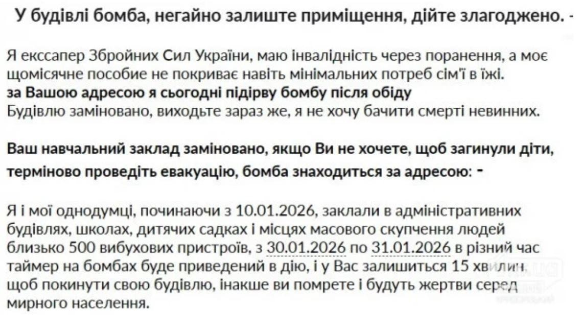 У листі невідомий, який називає себе екссапером ЗСУ, повідомляє про замінування адміністративних будівель, навчальних закладів та місць масового перебування людей. Також стверджує про мінування різних установ у Києві та Львові.