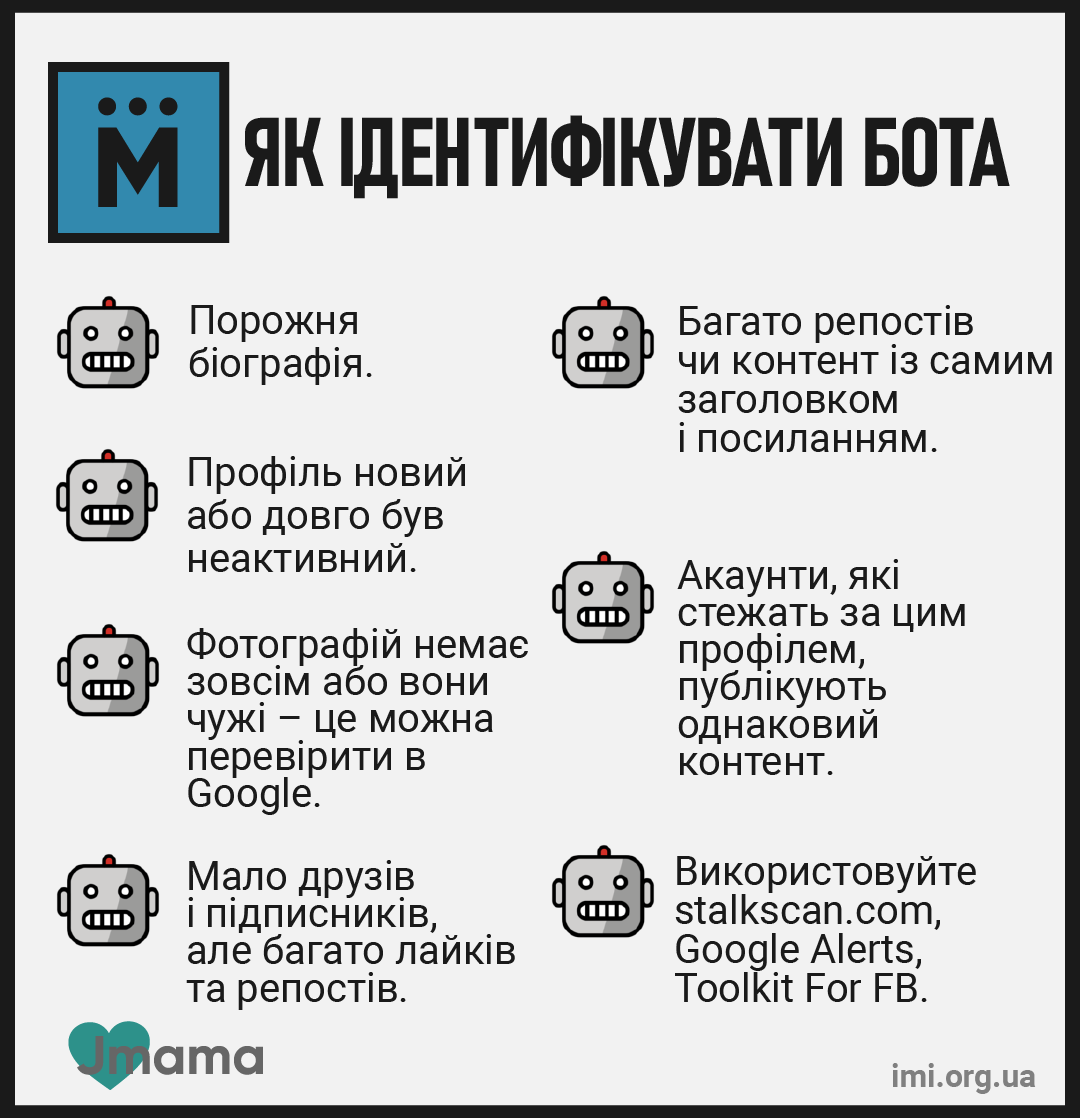 Рекомендуємо медійникам у разі атак ботів видаляти таких із друзів або блокувати ботів, які атакують їх в інтернеті. Також варто повідомляти про будь-яких шкідливі акаунти в адміністрацію соціальних мереж. Документуйте образливі або загрозливі повідомлення, включно зі скріншотами акаунтів, датою коментаря і будь-якими вжитими вами діями. Ця інформація може бути корисна пізніше, якщо ви хочете подати заяву в поліцію.