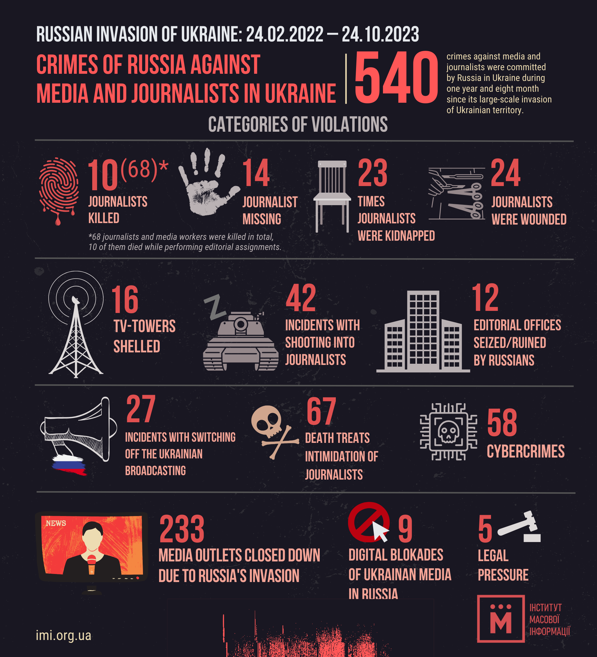 In the year and eight months since the start of the full-scale invasion Russia has committed 540 crimes against journalists and media in Ukraine.