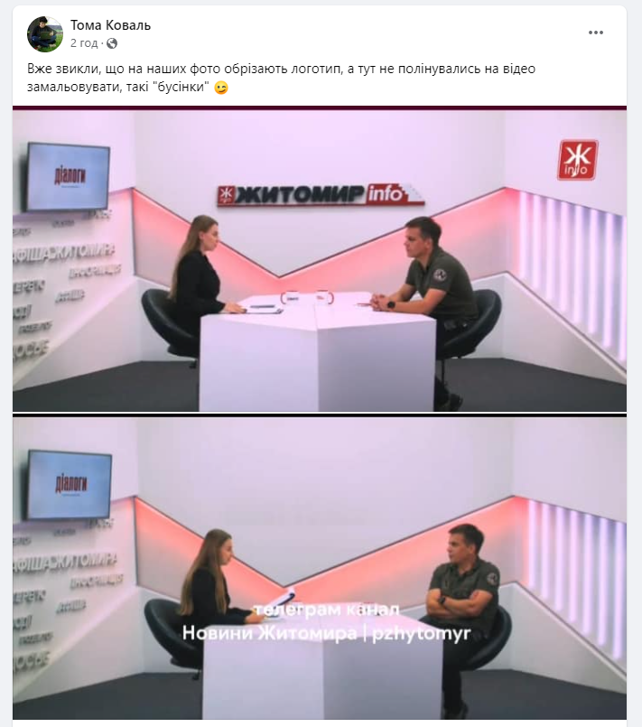 “Following the PZh post, the website “Zhytomyr Magazine” released news on the same topic, including a link to the PZh Telegram channel, and as early as 19:44. the Telegram channel “Zhytomyr 24” makes their own post. But PZh does not stop there and crops down a video excerpt from our livestream again, making it into a new post at 20:34. And in this video, they went through the trouble to not only erase our logo in the upper right corner, but also our huge logo that hangs on the wall in the studio and even on the cups that were on the table during the livestream,” explained Yulia Novytska.