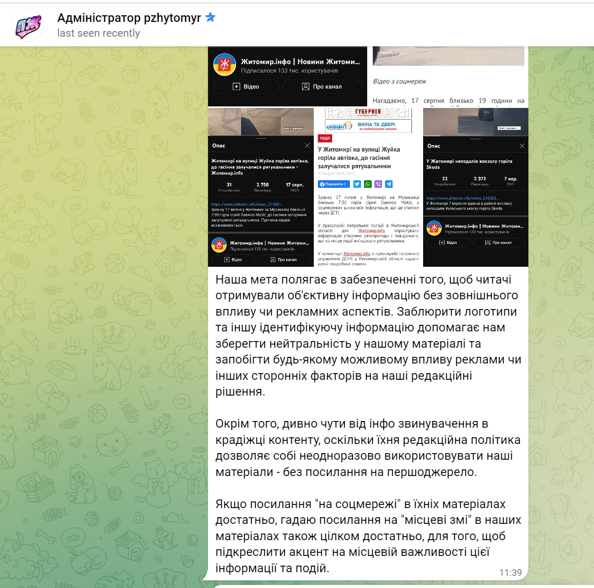 The online media outlet “Zhytomyr.info” reports that the local Telegram channel “pzhytomyr” (PZh) infringed on their copyright by cropping out the logo on their photos and blurring out their website’s name. Other outlets, namely the news website Zhytomyr Magazine, cited the PZh when sharing the news piece.