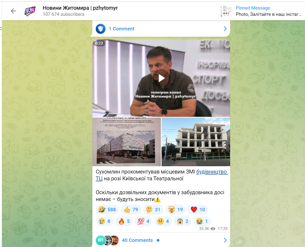On September 14 Mayor Serhiy Sukhomlyn was answering questions from the audience live on the program “Dialogues” by “Zhytomyr.info”. After the broadcast the journalists released the news report “Zhytomyr Mayor comments on the construction at the Kyivska–Teatralna intersection: they have no permit, it is to be demolished.”