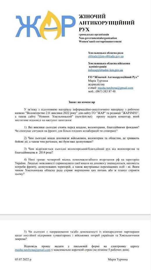 Khmelnytsky Regional Council failed to provide comments to ZHAR.INFO journalist Maria Turchyna regarding the region’s humanitarian needs and the Regional Council’s cooperation with international partners to provide for these needs. At the same time, comments on this topic have been provided to other mass media.