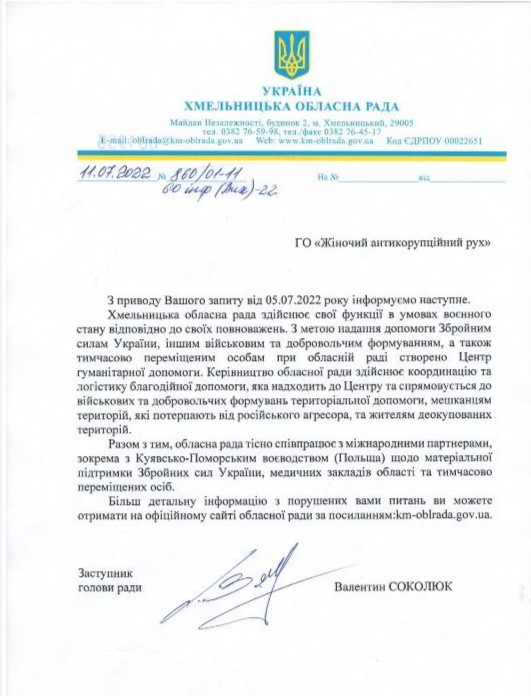 “The Regional Council closely cooperates with international partners, in particular, with the Kuyavian-Pomeranian Voivodeship (Poland) regarding material aid for the Armed Forces of Ukraine, regional medical facilities, and temporarily displaced persons. You can learn more details on the issues in question on the Regional Council’s official website at: https://km-oblrada.gov.ua“, reads the Khmelnytsky Regional Council’s formal response, signed by the Council’s Deputy Chairman Valentyn Sokolyuk.