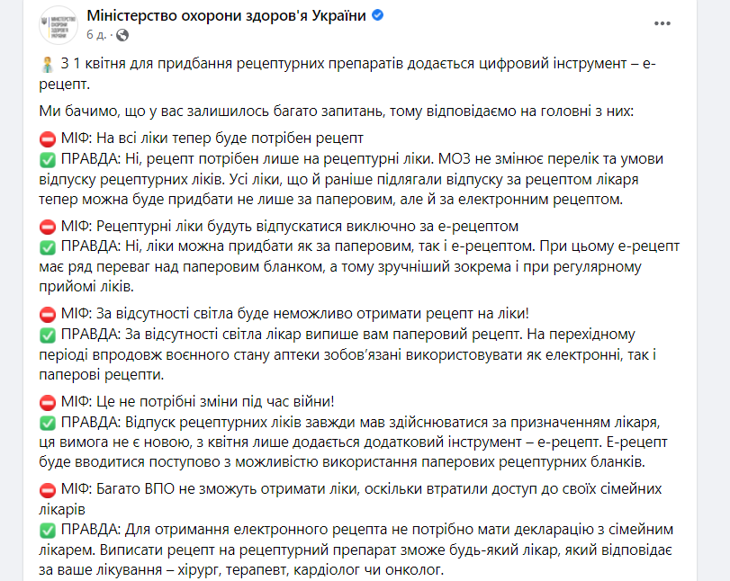 Крім того, 31 березня МОЗ надає чергові роз’яснення щодо запровадження електронних рецептів. У відповідній публікації спростовують низку тверджень, до яких переважно зводяться побоювання більшості постійних клієнтів аптек. Зокрема, тут нагадують, що рецепт, як і раніше, буде потрібен не на всі без винятку ліки, що паперові рецепти не скасовуються, що електронні зможуть отримати й ті, хто не має декларації з лікарем.