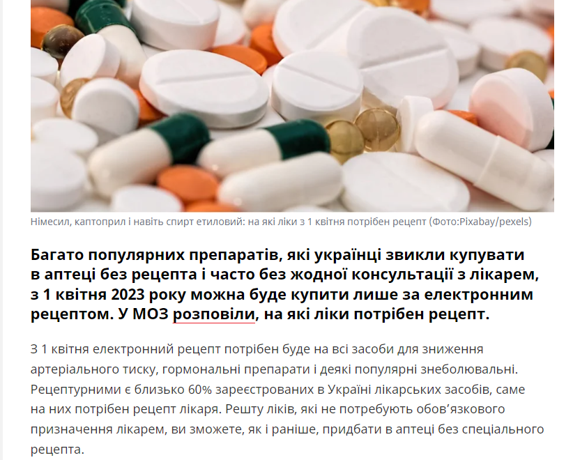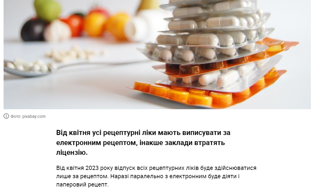 У цій статті стверджується, що “з 1 квітня усі рецептурні лікарські засоби в Україні почнуть продавати лише за електронним рецептом”. Крім того, цій некоректній інформації додано драматизму твердженням: “Як виявилось, багато популярних препаратів, які українці звикли купувати в аптеці без рецепта і часто без жодної консультації з лікарем, також належать до рецептурних. І на них також потрібен електронний рецепт”. Водночас читачеві не пояснюють, що “як виявилося” стосується лише людей, які брали участь у створенні матеріалу. Давно відомий факт, гарно або не дуже роз’яснений Міністерством охорони здоров’я, чи то став несподіванкою для редакції, чи був свідомо поданий як новина заради того, щоб емоційно навантажити текст. Але і цього творцям матеріалу здалося замало і вони додали: “Детальніше про препарати, які аптекар не матиме права продавати без рецепта з 1 квітня”.