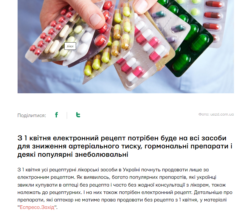 - В Україні з квітня можна буде купити за е-рецептом 60% ліків (РБК-Україна, 30.03)