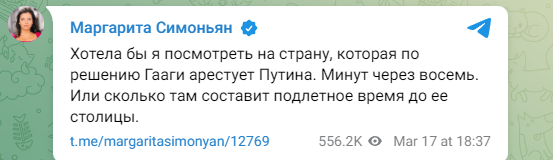Вправлятися в підміні понять та перекручуванні дійсності російським посадовцям продовжили допомагати й штатні пропагандисти. Маргарита Симоньян укотре підкреслила рівень свого інтелекту, коли в Telegram спробувала погрожувати іншим країнам, а насправді пообіцяла завдати ракетного удару по своєму президентові: “Хотіла б я подивитися на країну, яка за рішенням Гааги заарештує Путіна. Хвилин за вісім. Чи скільки там становить час підльоту до її столиці”.