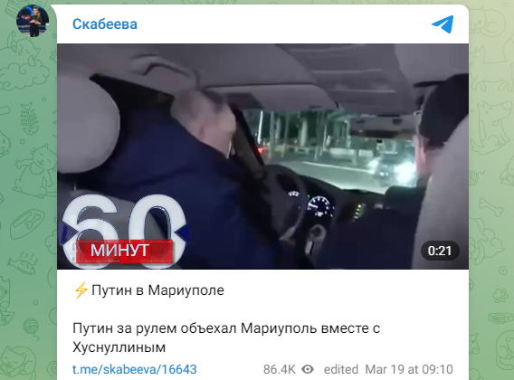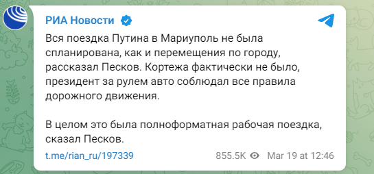 Про те, що підозрюваний у злочині геноциду президент Росії, якого мають заарештувати за ордером Міжнародного кримінального суду, їздив Маріуполем за кермом автомобіля, також розписали, крім уже згаданих, російські телеканали “Перший” та “Россия 24”, видання “RT на русском”, “Комсомольская правда”, НТВ, РЕН ТВ, РИА Новости, ТАСС, РБК, “Вести”, Readovka, пропагандистські канали в Telegram “Военный осведомитель”, “Кремлевская прачка”, “Повёрнутые на Z войне” та інші, а також кілька разів про це згадав під час брифінгу Дмитро Пєсков.