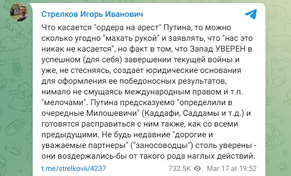 Нестача оптимізму помітна і в дописах терориста Ігоря Гіркіна. Але на тлі інших цей персонаж видається дещо ближчим до реалій. У своєму телеграм-каналі “Стрелков Игорь Иванович” він зазначає, що стали дійсністю його прогнози – Захід застосовує до Путіна метод “повільного варіння жаби”. Тобто, на думку Гіркіна, ордер на арешт Путіна означає, що його “призначили в чергові Мілошевичі (Каддафі, Саддами)” і на нього чекатиме та ж доля.