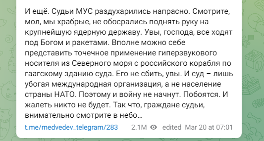 Щоб світ не забув, наскільки альтернативним є російське розуміння міжнародних відносин, до справи доклався і заступник голови російського Радбезу Дмитро Медведєв. Коментуючи рішення Міжнародного кримінального суду щодо ордера на арешт Володимира Путіна, він поскаржився на “остаточне руйнування системи міжнародного права”. Втім, занепокоєння долею міжнародного права не завадило Медведєву погрожувати Нідерландам ракетним обстрілом: “Усі ходять під Богом і ракетами. Цілком можливо собі уявити точне застосування гіперзвукового носія з Північного моря з російського корабля по гаазькій будівлі суду”.