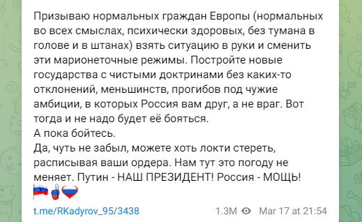 Голос із паралельної реальності подав і призначений Кремлем очільник Чечні Рамзан Кадиров, який через канал у Telegram “Kadyrov_95” заявив, що за депортацію дітей України до Росії Путіна треба було “на Нобелівську премію висунути”. Крім того, дописувач каналу закликає громадян країн Європи до зміни законного ладу: “Взяти ситуацію в руки й змінити ці маріонеточні режими. Побудуйте нові держави якихось відхилень, меншин, прогинів під чужі амбіції”. Поряд з тим найбільш симптоматичними видаються речення, якими закінчується допис: “Путін – наш ПРЕЗИДЕНТ! Росія – МІЦЬ!” Саме так – капслоком доводить свою правду Kadyrov_95.