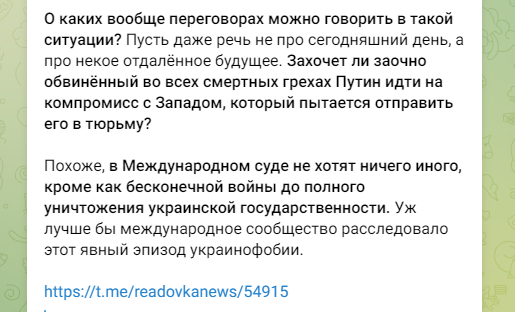 Пропагандистський ресурс Readovka у зв’язку ордером на арешт Путіна став стверджувати, що “в Гаазі хочуть воювати до “останнього українця”. “Демарш Міжнародного кримінального суду важко коментувати спокійно”, – зізнається неназваний автор тексту. Він переконує, що рішення МКС унеможливлює компроміс Заходу з Росією та робить висновок: “У Міжнародному суді не хочуть нічого іншого, крім як безкінечної війни до повного знищення української державності. Краще б міжнародна спільнота розслідувала цей явний епізод українофобії”. Водночас дописувач не помічає суперечності у своїх же словах, адже якщо війна “безкінечна”, то логічно, що вона не матиме результату, зокрема у вигляді “знищення української державності”.