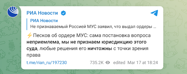 Реакцію Кремля словами речника Дмитра Пєскова транслювали більшість пропагандистських ресурсів Росії, зокрема РИА Новости. “Саме поставлення питання неприйнятне, ми не визнаємо юрисдикції цього суду, будь-які його рішення нікчемні з погляду права”, – переповіло видання Пєскова.