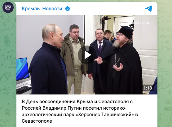 Тобто ще напередодні навіть у думках кремлівських діячів не було показувати Путіна на території України, рішення було ухвалене поспіхом. Притому що всі пропагандистські ресурси підкреслювали, що російський президент відвідав Крим саме в так званий “день возз’єднання Криму і Севастополя з Росією”, диктатор не взяв участі в жодному заході, присвяченому саме цьому вдаваному святу.