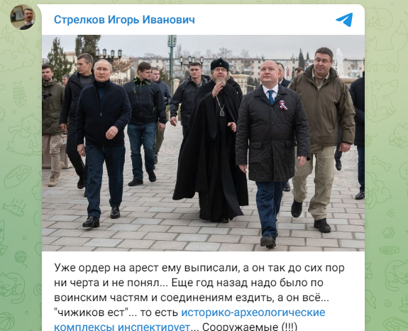 Зв’язок між ордером та поїздкою на тимчасово окуповані території України помітив той-таки Ігор Гіркін. “Уже ордер на арешт йому виписали, а він так досі нічого не зрозумів. Ще рік тому треба було військовими частинами та з’єднаннями їздити, а він усе “чижиків їсть”, тобто історико-археологічні комплекси відвідує, – пише блогер-терорист у Telegram і резюмує: – Кретинізм цвіте та пахне, і немає йому кінця та краю”.