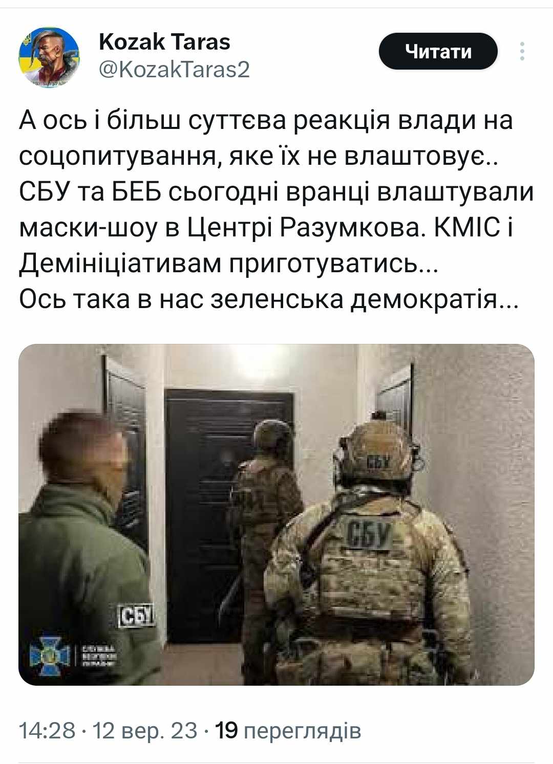 Низка анонімних акаунтів у соцмережах Facebook та X повідомила 12 вересня про нібито обшуки Служби безпеки України та Бюро економічної безпеки України в офісі соціологічної служби Центр Разумкова через опитування щодо відповідальності президента Володимира Зеленського за корупцію.