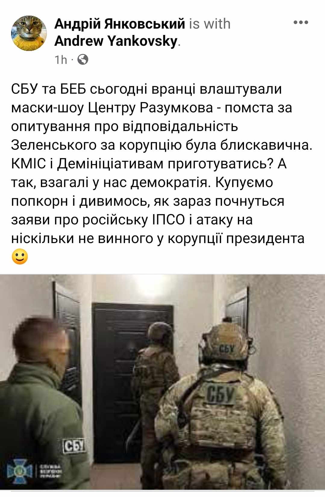 Усі ці пости містили однакове речення: “СБУ та БЕБ сьогодні вранці влаштували маски-шоу Центру Разумкова – помста за опитування про відповідальність Зеленського за корупцію була блискавична”. Деякі також дописували: “КМІС та Демініціативам приготуватись?”