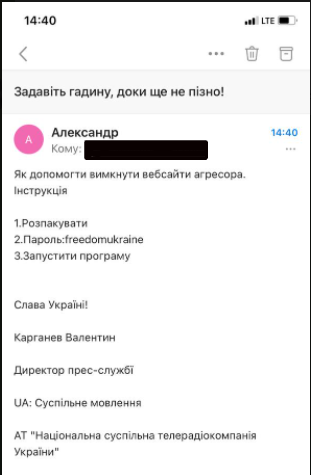 4 березня громадянам України почали надходити електронні листи із підозрілим вмістом нібито від пресслужби Суспільного мовника. Зверніть увагу: Суспільне не надсилало листів із подібним закликом, ймовірно, це фішингова атака!